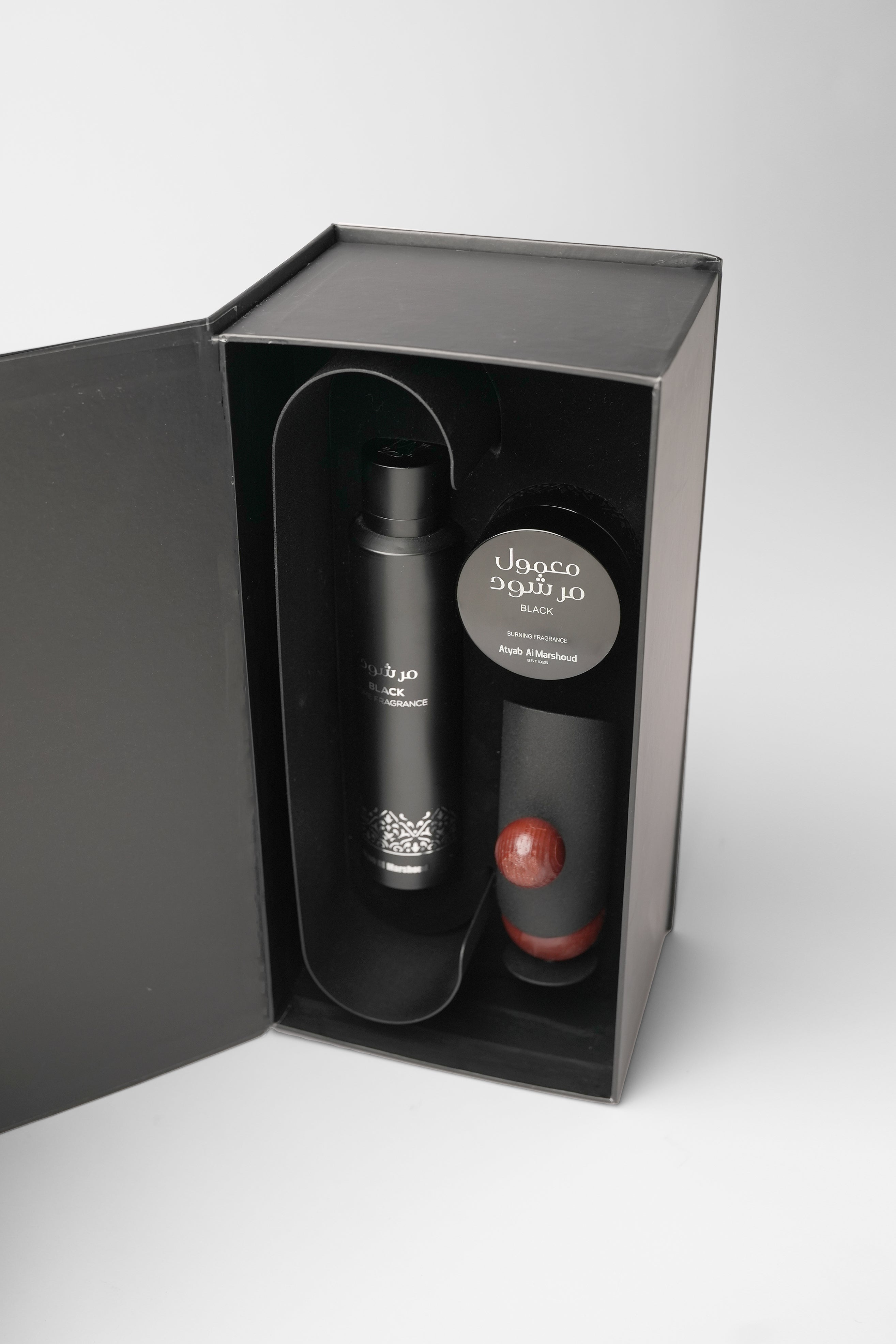 Make every home moment special with the perfect gift, a refined set that includes our best-selling Marshoud Black Mamool and home fragrance, complemented by an elegant burner. A stylish décor piece and a thoughtful gift for your loved ones, offering timeless scent and exceptional value.